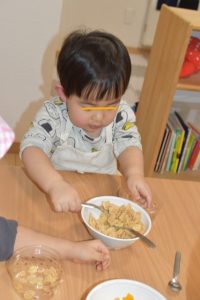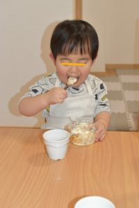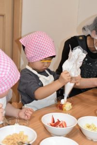 パフェづくりを行いましたよ✨朝から『内緒のおやつ作るんだ~』ととっても楽しみにしていた子ども達❤いつもより短いお昼寝でしたが、すぐに目が覚め準備に取り掛かっていましたよ🎵