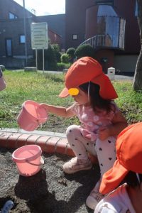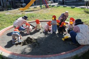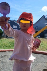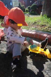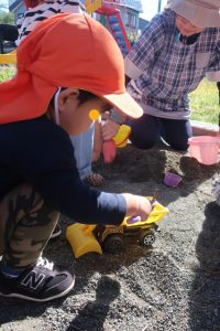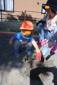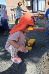 みんなで大きな山を作ったり、細長い道路を作ろうとスコップで掘ったりと玩具を持ち寄り頑張っていました(^-^)♪