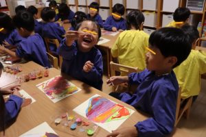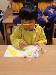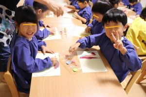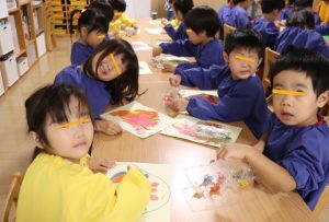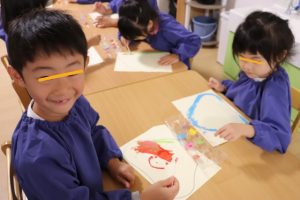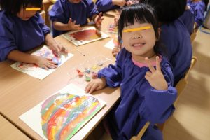 すみれ・こすもす・ひまわり組さんは、絵の具を使った製作を楽しみました🍂