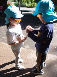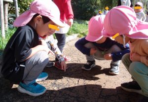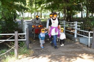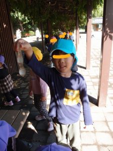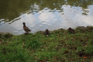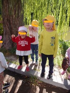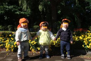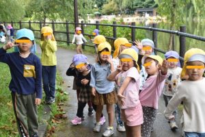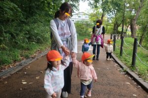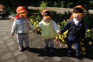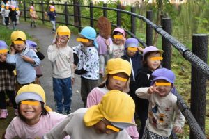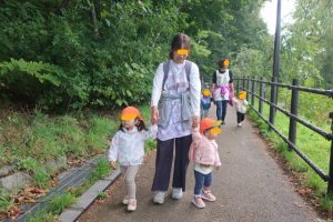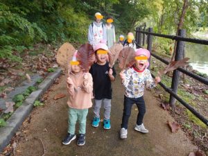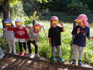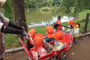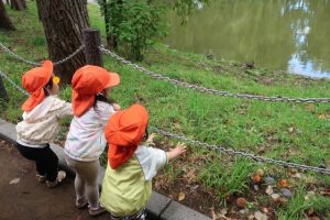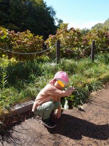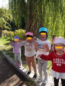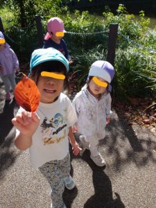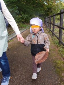 公園には沢山のカモが泳いでいたり、顔が隠れるくらいの大きな葉っぱやダリア、マリーゴールドのお花など魅力的なものがいっぱいあり、子どもたちは伸び伸びと探索を楽しんでいましたよ♪