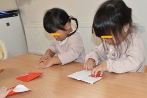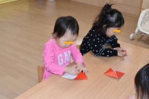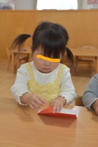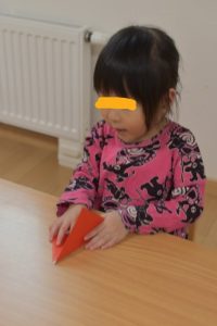 お手本を見ながら自分で『おりおり♪』と声に出しながら折り進めたり、手をおひざにして手順を聞いたりと、真剣に取り組んでいましたよ♪