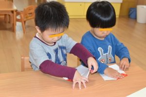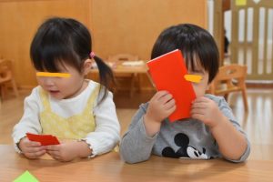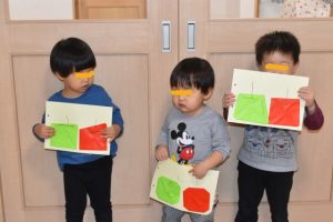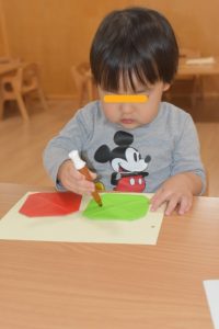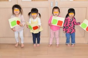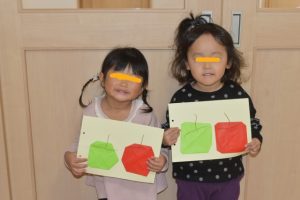ちゅうりっぷ組さんは、折り紙で赤りんごと青りんごを折りました!