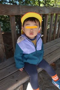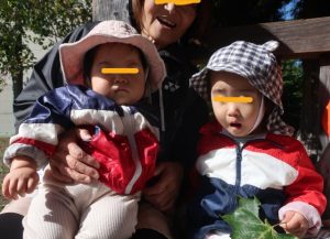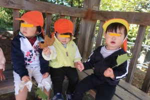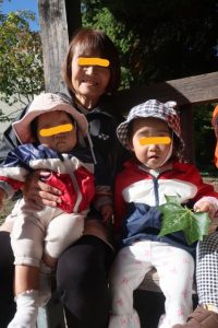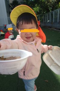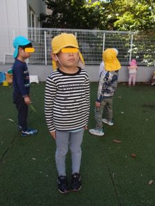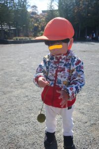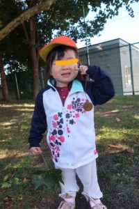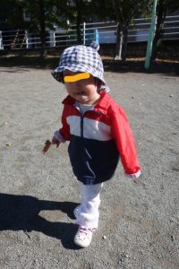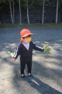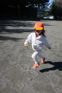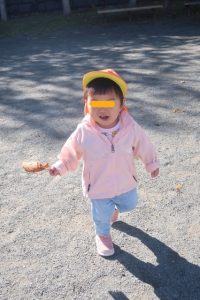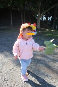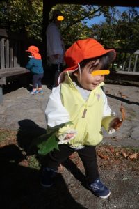 公園には大きな落ち葉が沢山落ちており、両手に持ってパタパタさせながら走ったり、プラタナスの実を見つけて『痛い?』『チクチク?』と不思議そうに眺めていましたよ♪