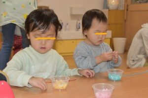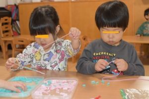 ちゅうりっぷ組さんは、お店屋さんごっこに向けてネックレス作りをしました。