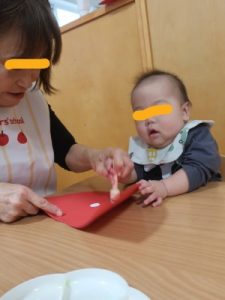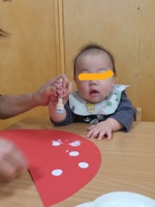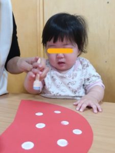 タンポを使っての絵の具スタンプにドキドキして涙も出ましたが、素敵な模様が出来上がりましたよ♪