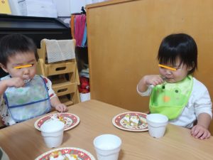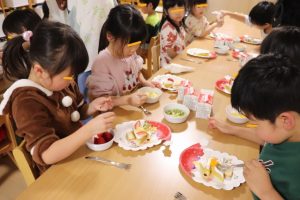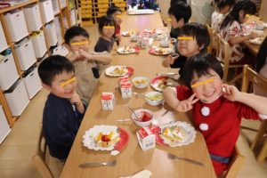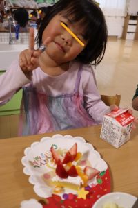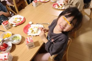 すみれ・こすもす・ひまわり組さんは、好きなフルーツをのせたりクリームを絞ったりと自分で飾りつけをしましたよ✨