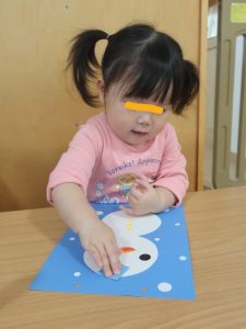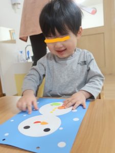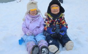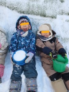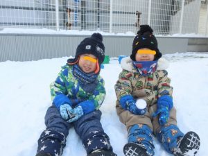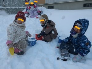 お友だちと一緒にお尻滑りをしたり、バケツやカップに雪を詰めたりと寒さに負けず元気に遊びました(^-^)