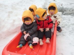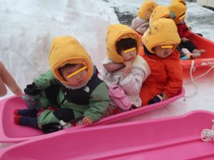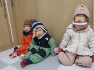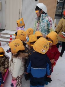 冬になり、スキーウェアを自分で着て靴を履いての避難は夏よりも時間がかかってしまいますが、一人ひとりが一生懸命がんばっていましたよ(*^^*)