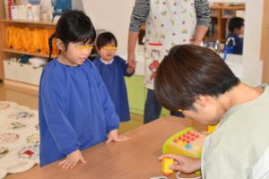 最初は、園長先生にカードをピッとしてもらいせっけん用の型をもらいます。