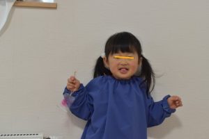 絵を描き終わったお友だちから、園長先生にトースターで焼いてもらいます。小さくなる様子に、驚いてニコニコする子や変化にちょっぴり不安そうにする子もいましたよ(^^)