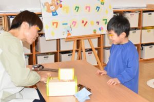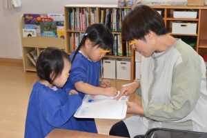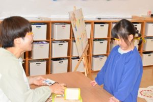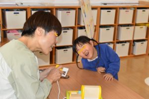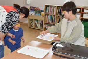 最初は、園長先生にカードをピッとしてもらいせっけん用の型をもらいます。