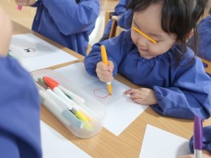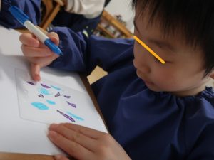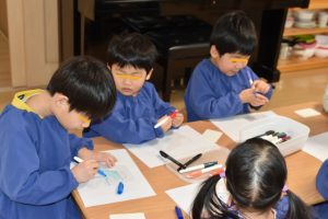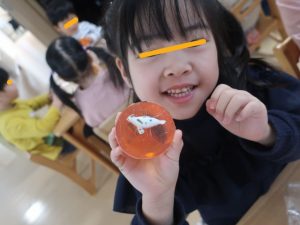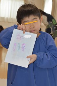 せっけんを溶かしている間は、プラ板を使ったキーホルダー作り✨何を描こうかな~と悩みながら嬉しそうにスラスラとペンを走らせていましたよ(*^-^*)