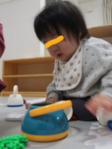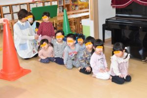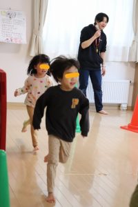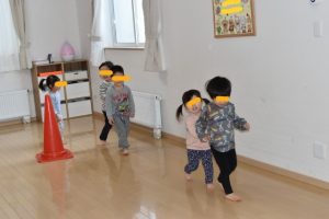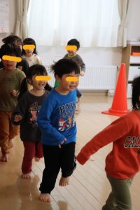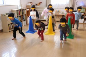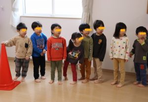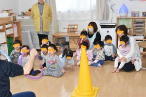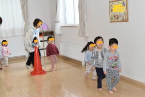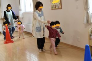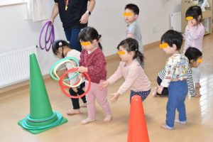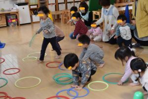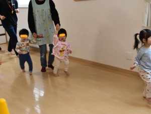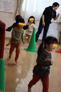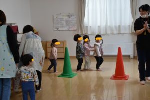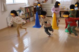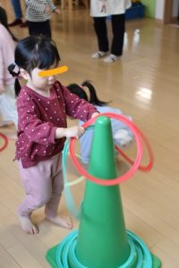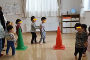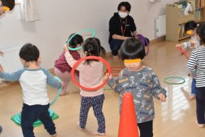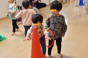ちゅうりっぷ組さんの体操では、コーンの周りを一列になって走ったり、コーンの色と同じ色の輪をかけたりとお話をよく聞きながら参加していましたよ♪