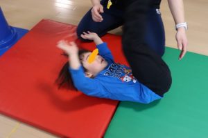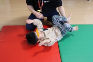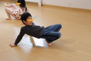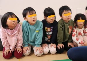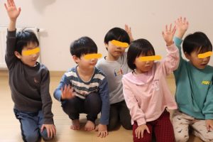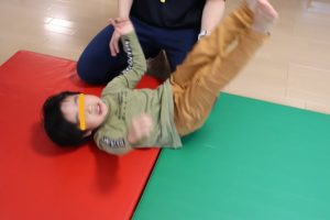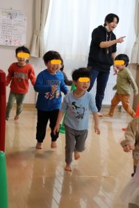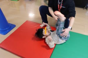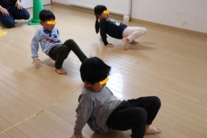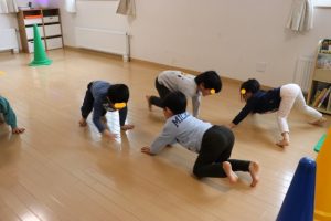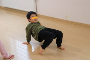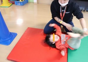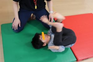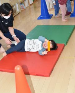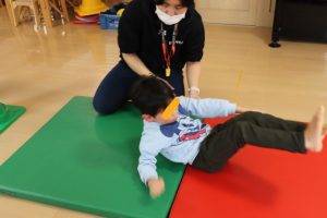 えんぴつに変身をしてマットの上をコロコロ回る活動は、ちょっぴり難しそうにしながらもニコニコで取り組んでいた子どもたちです(^-^)