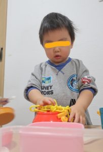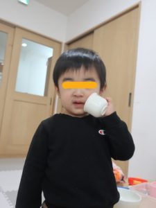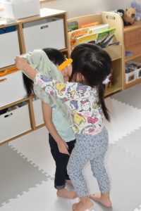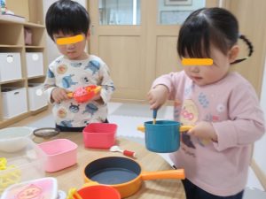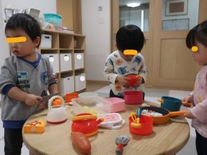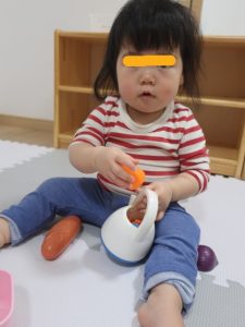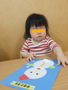 室内では、シール貼りをしたり、ままごとをしたりとじっくりと遊びこんでいました♪