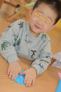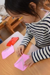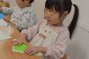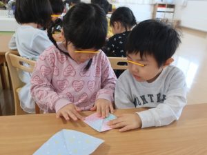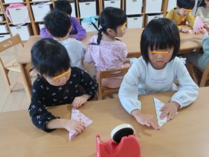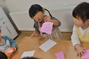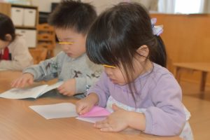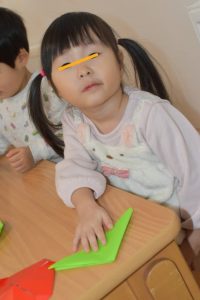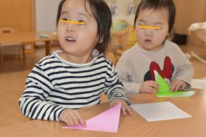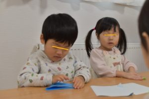 今日のちゅうりっぷ組さんは、折り紙で雪だるまを作りましたよ⛄