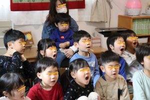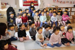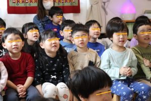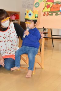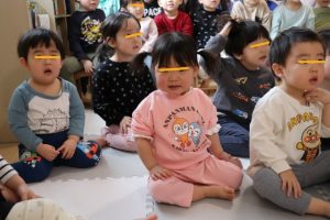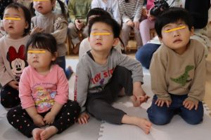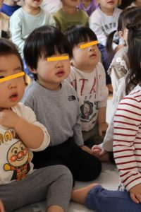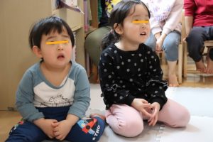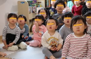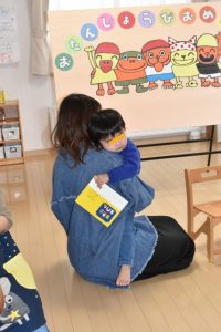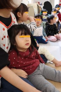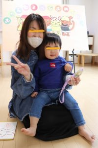 今日は、お誕生児さんが1名で不安と緊張でしたが先生と一緒に歩いて入場してくれましたよ🎵最後は、お母さんのお膝の上でちょこんと座り安心して最後まで参加する事ができました(*^-^*)