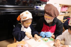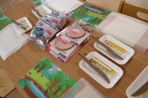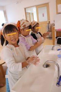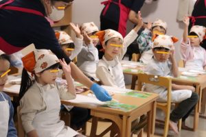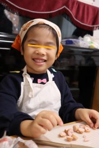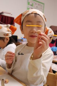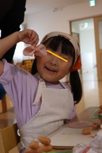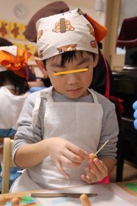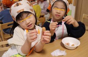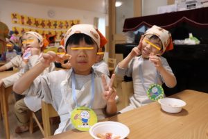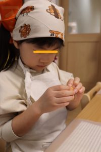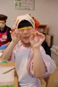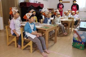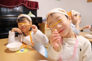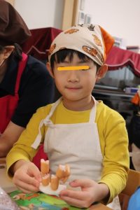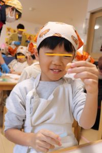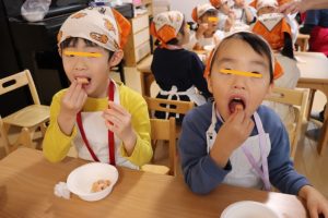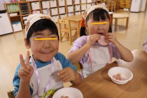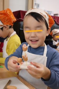 「食べ物と体」についてスライドでお勉強をした後は、ウインナーとハムを飾り切りし、美味しくいただきました。真剣なお顔で飾り切りに挑戦し可愛く出来上がってとっても嬉しそうでしたよ♪