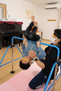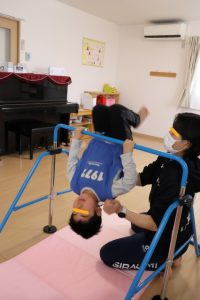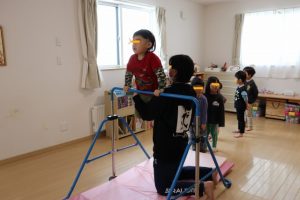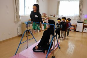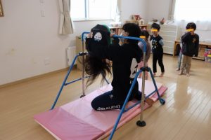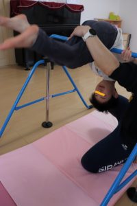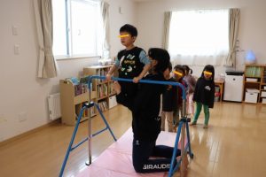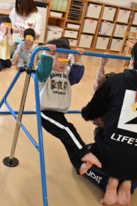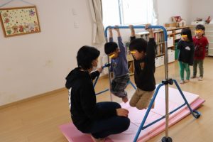 今回は、鉄棒にも挑戦しました✨ちょっぴり怖くて不安そうにするお友だちもいましたが先生に支えられながらがんばりましたよ(*^^*)